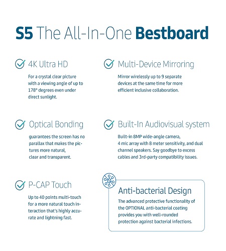 Description: Bestboard® S5 is essentially a powerful combination of Interactive Whiteboard, Videoconferencing Endpoint and Wireless Content Sharing Server, its All-In-One design solves the hassles of complex AV installation and blends perfectly with your office decorations in fashion. Bestboard® S5 transforms your conventional meeting room into a future-proof ready unified communication and collaboration workspace. Key Feature A Canvas-like Interactive Whiteboard allows you to make annotations page over page, and the capacitive stylus lets you write effortlessly just like the pen you used to have A conferencing-ready 8MP camera enables video in your meeting room, and you can now bring your remote teams together in one place with just one touch of your favorite apps such as Microsoft Teams, Cisco Webex, Zoom, and more A studio-quality audio system with 15W stereo speakers and a 4-element microphone array that equips Echo Cancellation, Vocal Enhancement and Noise Reduction, nicely pick-ups your voice within an 8-meter range and delivers a crystal-clear audio experience during meetings A wireless content sharing hub for up to 9 devices sharing their screens wirelessly during meetings - supports Windows 10, macOS, iOS and Android OS Embedded Android OS 8.0 and a powerful 8-Core ARM chipset allow you to access more than 1 million apps and opens up enormous possibilities for team communication and collaboration Supports OPS computing, you can now run dual operating systems Windows 10 and Android 8.0 at the same time and ensures your IT will have no problem deploying the most popular OS in the world Main Specification Model Name: S5C Size: 65" and 86" Display: 4K LG IPS Panel, 3840 x 2160 (60Hz) resolution Glass: 7H Hardness Full laminated AG Explosion-Proof Matt Tempered Glass Protection: Anti-glare, Anti-blue light, Anti-fingerprint, Antibacterial (optional) Touch: 10-point Capacitive Touch (up to 40-point), supports Finger and Stylus 4096-Level Pressure Sensitivity Camera: 8MP CMOS Sensor, FOV 84°, Auto Focus Microphone: 4-element Microphone Array Speaker: 15W x2 Embedded OS: Android 8.0 CPU: Dual-Core A73 + Dual-Core A53 GPU: Quad-Core Mali-G51 RAM: 4GB Storage: 32GB Connectivity: WiFi 5 (802.11 a/b/g/n/ac) Dual Band 2.4/5GHz, Bluetooth 4.0, Dual LAN RJ45 (Gigabit Ethernet 10/100/1000Mbps) Output: HDMI x1, AUX 3.5mm x1, SPDIF x1 Input: USB Type-C x1, USB 3.0 x2, USB 2.0 x1, USB-Touch x1, DP x1, HDMI x2, VGA x1, AUX 3.5mm x1, RS-232 x1 Dimension (LxWxH): 1511.5 x 60 x 866.5mm (65"), 1978 x 60 x 1149mm (86") Net Weight: 49Kg (65”), 88.8Kg (86”) Package S5C x1 Stylus x1 Remote Controller x1 Power Adapter x1 Wall-mounted rack x1 User Manual x1 Warranty Card x1